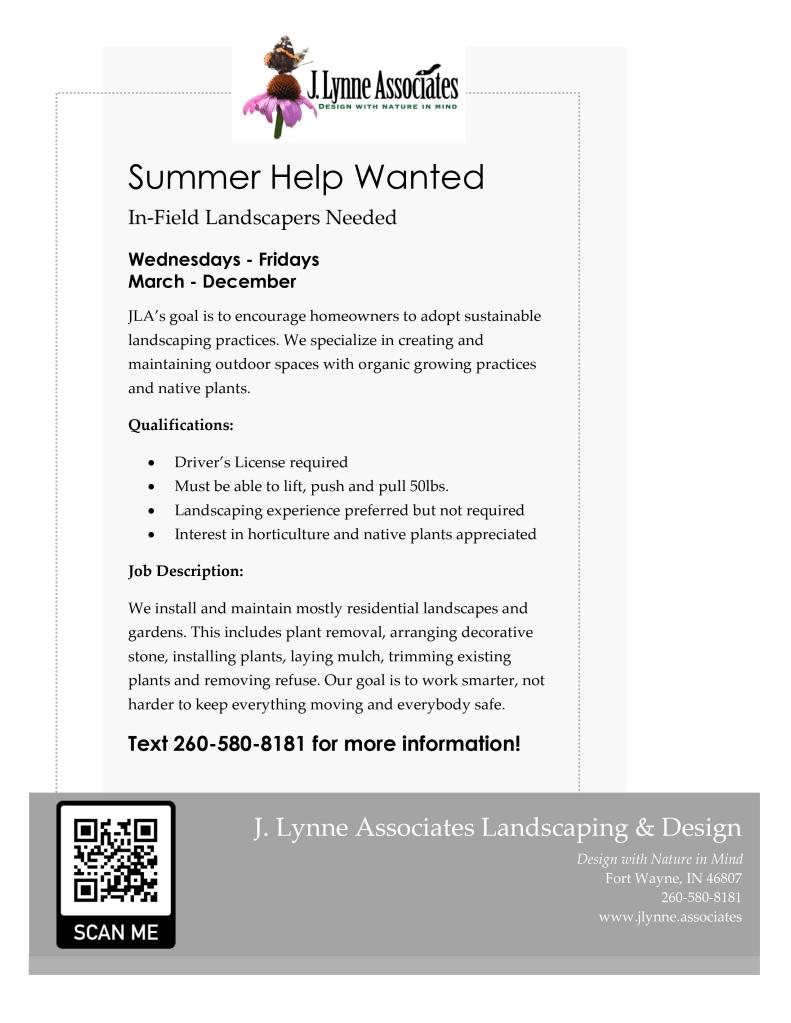 J. Lynne Associates is looking to add several crew members this season to assist in current operations and to help us continue learning and growing. Whether you are looking for a short term summer job or want to get outside after wrapping up an indoor career, let’s explore working together. Check out the poster below for more information and contact Judith via the contact page or by texting her number listed.